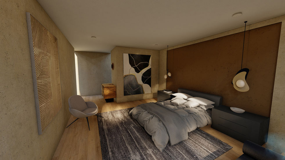 In this project, I want to bring a rusty antique breeze into the modern architecture of a condo on 540 De Haro St, San Francisco. The master bedroom embraces the contemporary style with an infusion of rustic elements, such as: bronze wall panels and an antique patchwork copper cabinet by Paul Evans.